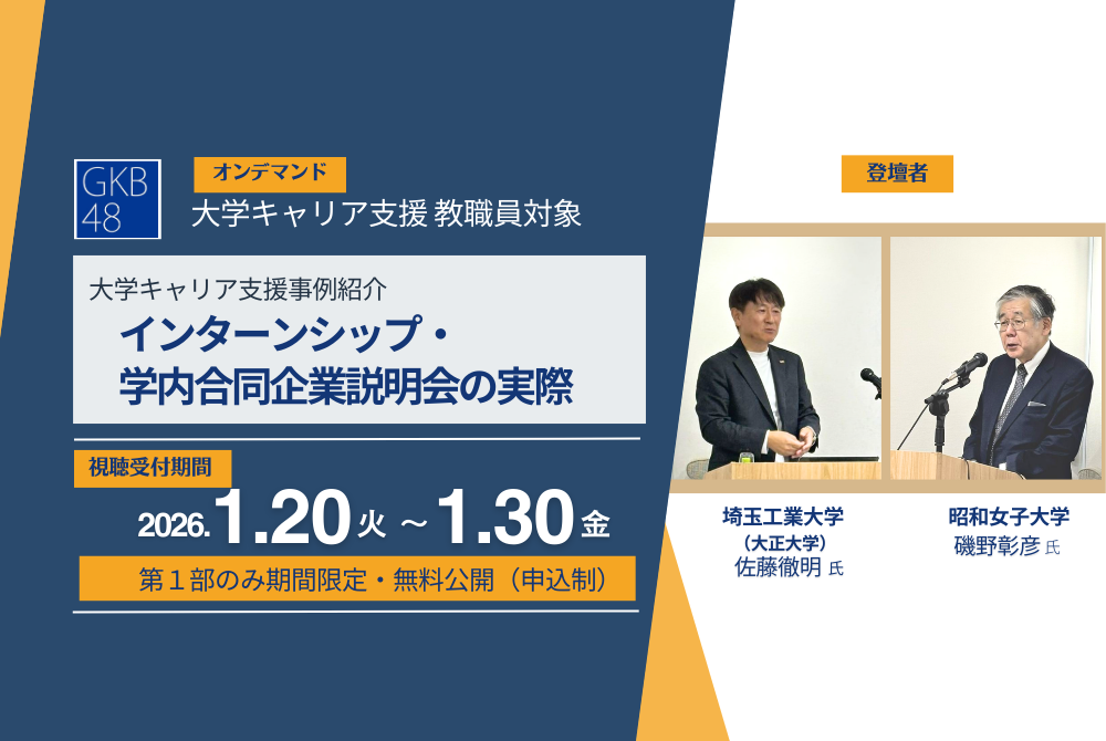 学生の就職活動が早期化・多様化する中、大学キャリアセンターの現場には多くの取り組みをどう位置づけ、何を優先するのかという判断がこれまで以上に求められています。2025年12月2日に開催されたGKB48セミナーでは、大学キャリアセンターの責任者、経験者がインターンシップや学内合同企業説明会での課題を中心に語りました。